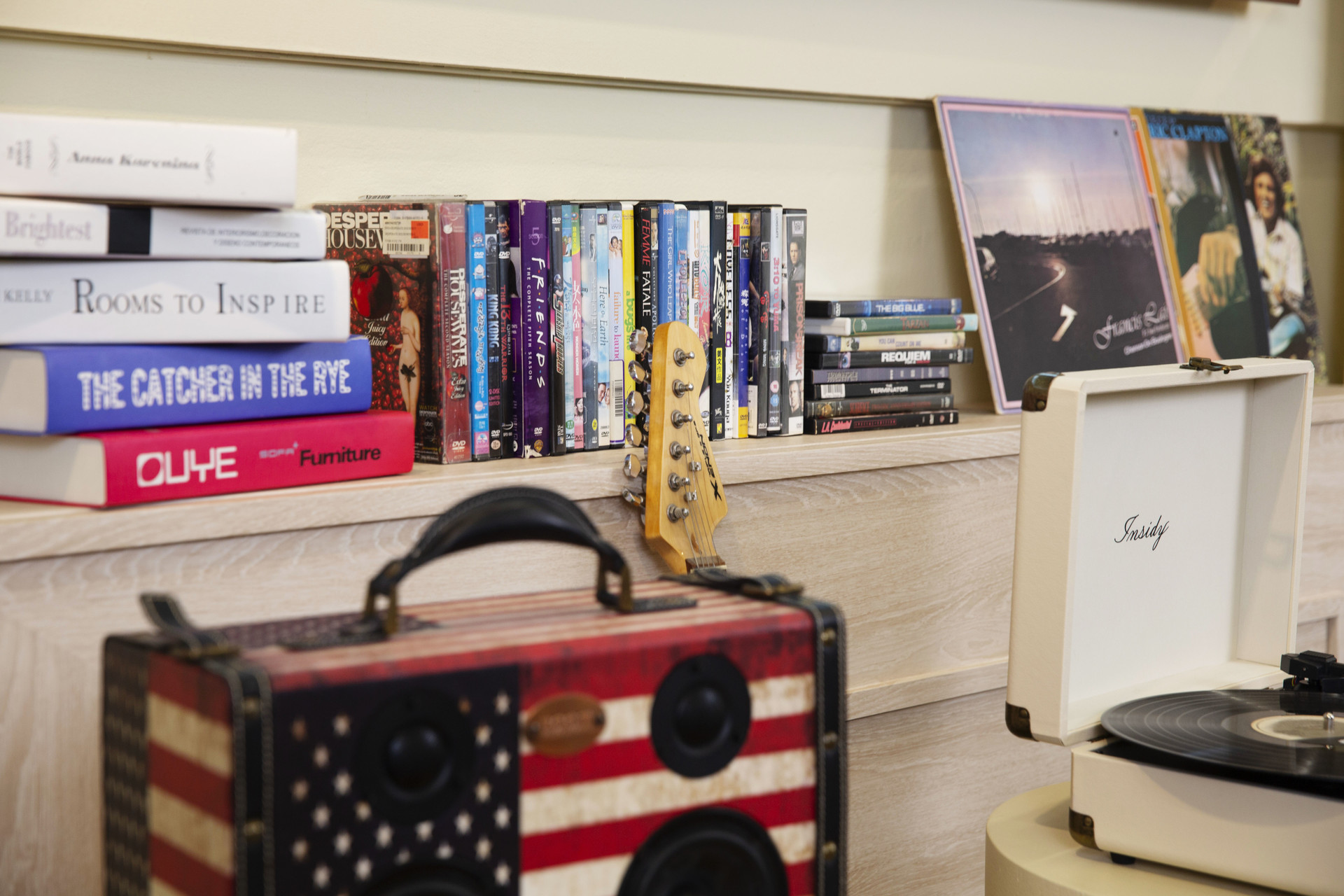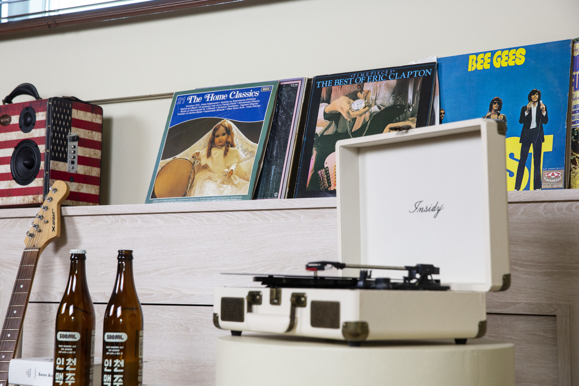 빈티지 LP 플레이어와 다채로운 CD 컬렉션,